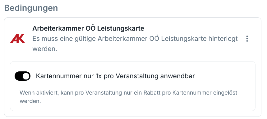 | ✔ Bei den fixen Ermäßigungen könnt ihr nun auch die Leistungskarte der Arbeiterkammer Oberösterreich integrieren. ✔ Beim Ticketkauf wird die Kartennummer live validiert und die Ermäßigung automatisch gewährt. 💡Achtung: Aktuell ist diese Funktion ausschließlich für Leistungskartenbezieher:innen aus Oberösterreich verfügbar. |