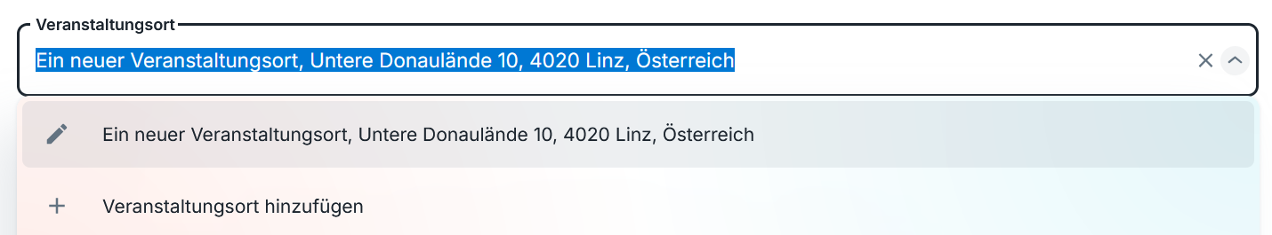 | ✔ Veranstaltungsorte, die nicht in der Suche erscheinen (weil sie nicht bei OpenStreetMap hinterlegt sind), könnt ihr ab sofort selbst hinzufügen und speichern. ✔ Veranstaltungsorte könnt ihr direkt bei Veranstaltungen und Veranstaltungsreihen erstellen und bearbeiten. ✔ Orte müssen nun nicht mehr jedes Mal neu hinzugefügt werden, sondern bleiben dauerhaft gespeichert. |