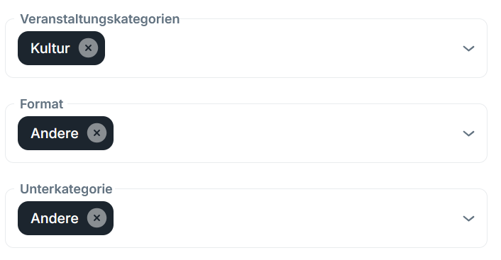 | ✔ Ab sofort könnt ihr bei der Erstellung neuer Veranstaltungen passende Haupt- und Unterkategorien auswählen. Insgesamt stehen fünf Hauptkategorien mit jeweiligen Unterkategorien zur Verfügung. ✔ Sobald ausreichend Veranstaltungen kategorisiert sind, können wir im Webshop eine Such- und Filterfunktion integrieren und Käufer:innen künftig auch ähnliche Veranstaltungen empfehlen. Das bedeutet mehr Sichtbarkeit für eure Events. ✔ Bei bestehenden Veranstaltungen wurde automatisch die allgemein gehaltene Kategorie „Kultur – Andere“ hinterlegt, damit es beim Bearbeiten zu keinen Fehlermeldungen kommt. ✔ Solange es noch keine Filterfunktion gibt, könnt ihr das entweder ignorieren, oder ihr nutzt die Gelegenheit und testet das neue Kategoriensystem direkt anhand eurer bestehenden Events. |